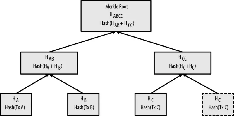由于默克尔树时二叉树,因此它需要偶数个叶子节点。如果仅有奇数个交易需要归纳,最后一个交易会被复制以构成偶数个叶子节点。如下图所示,C 节点会被复制。