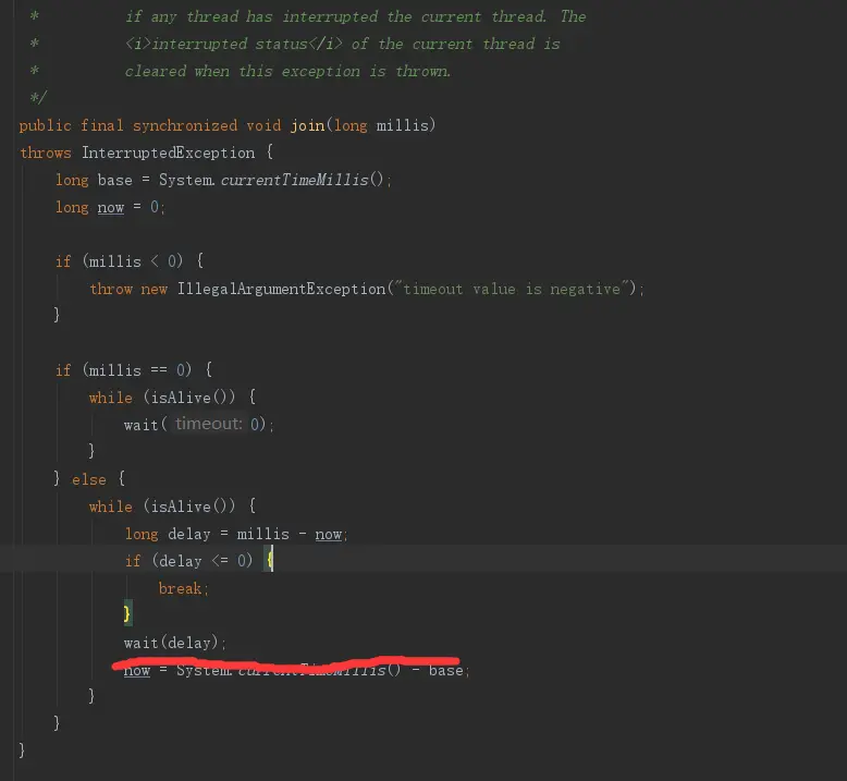 先来说一下,创建一个线程时候JVM 内存分配区域划分,程序计数器,Java栈,本地方法是线程私有的,以及需要为线程分配一定的内存空间,所以创建一个线程是很消耗性能的。调用Thead.start() 干的就是我上面说描述的那些事情,只有当上面那些事情做完以后,线程才是进入到就绪状态。 我们重点说一下阻塞状态,如果当前只有一个线程,如果调用Thread.Sleep() 方法会使当前线程进入阻塞状态,这里Sleep 使用的是静态方法。源码的方法注释是说,使当前正在运行的线程进入睡眠状态,但是线程不会失去任何监听器的权利(锁) 也就是说当前线程会在执行的时候会进入睡眠,当睡眠时间过了以后又会继续执行下面的代码了。阻塞 2.wait() 这个方法特殊啊,因为每一个类中都有的方法,这个方法是所有的类都有这个方法。源码注释:当前线程等待直到其他线程调用当前对象的notify 或者notifyall 。换句话说次方法就是简单的执行呼叫,当前线程必须拥有该对象的监视器,线程释放监视器(锁)并且等待直到另外一个线程通知在此对象的锁上等待唤醒的线程。直到可以重新获得锁并且执行恢复执行。阻塞的方式还有join() 我们来看一下join() 方法中是怎么实现的,join()方法是同步阻塞。