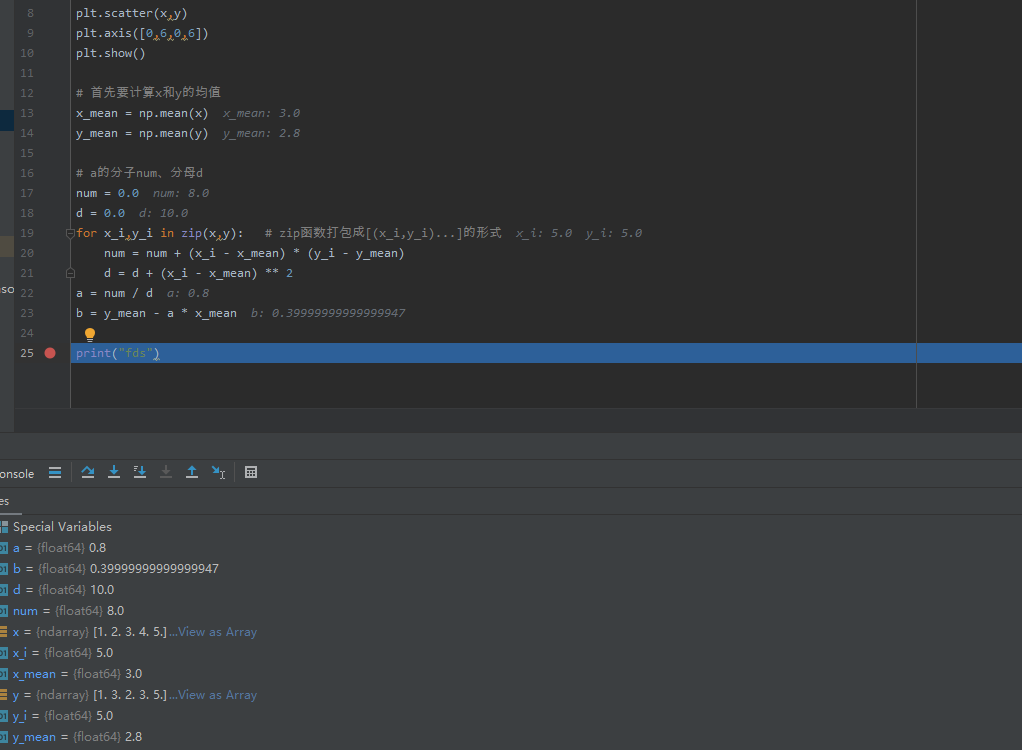 首先创建一组数据,然后生成SimpleLinearRegression()的对象reg1,然后调用一下
