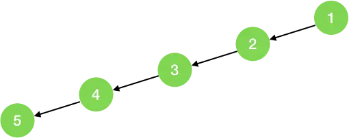 最坏情况,如果此二叉树是如图所示(只有左节点,没有右节点),则树的高度即结点的个数 n,此时空间复杂度为 O(n),总的来看,空间复杂度为O(n)