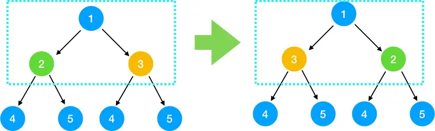2.查找问题与子问题的关系,得出递推公式 我们之前说了,解题要采用自上而下的思考方式,那我们取前面的1, 2,3 结点来看,对于根节点 1 来说,假设 2, 3 结点下的节点都已经翻转,那么只要翻转 2, 3 节点即满足需求