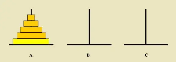 接下来我们看一下大学时学过的汉诺塔问题: 如下图所示,从左到右有A、B、C三根柱子,其中A柱子上面有从小叠到大的n个圆盘,现要求将A柱子上的圆盘移到C柱子上去,期间只有一个原则:一次只能移到一个盘子且大盘子不能在小盘子上面,求移动的步骤和移动的次数