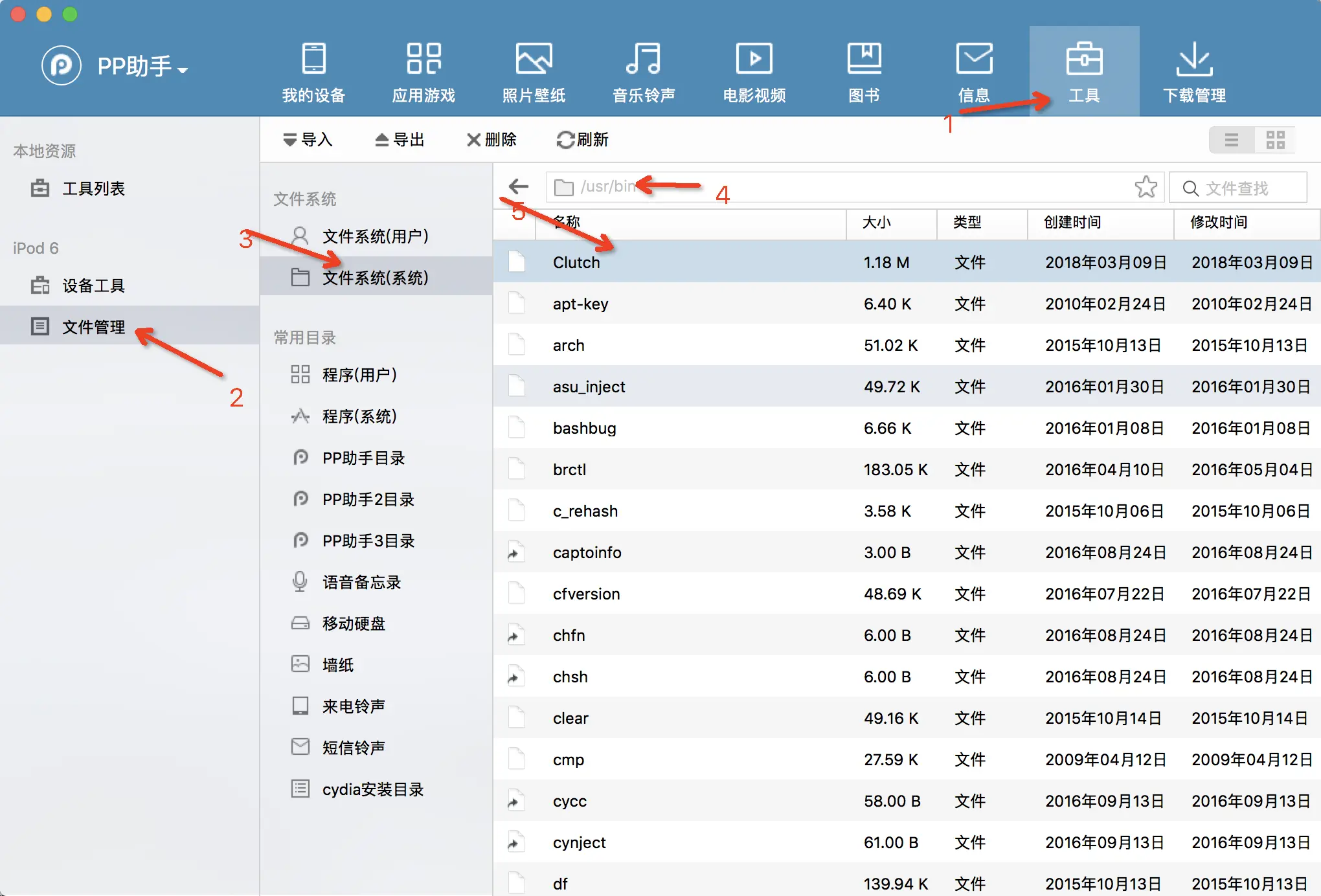 4.2 下载电脑版本的PP助手,用已经越狱的设备连接电脑,然后打开PP助手 --> 工具 --> 文件管理 --> 系统文件(系统) --> usr --> bin 。把步骤1的可执行文件放入bin目录下(这边用爱思助手也是可以的, 我用的就是爱思助手).