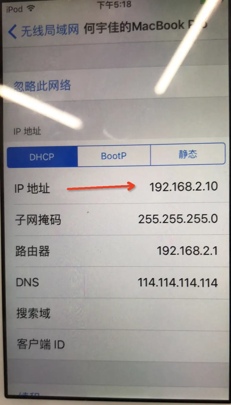 4.4 让越狱的手机与电脑连接在同一个WiFi中(可以电脑开WiFi共享给手机),获取手机连接WiFi的IP.