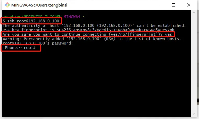 4.5 输入ssh root@192.168.2.10这里的IP地址填入步骤4所记录下来的手机IP(如果连接不上,请确认设备已经安装好了Open SSH,并且设备的WiFi与电脑是同一个)