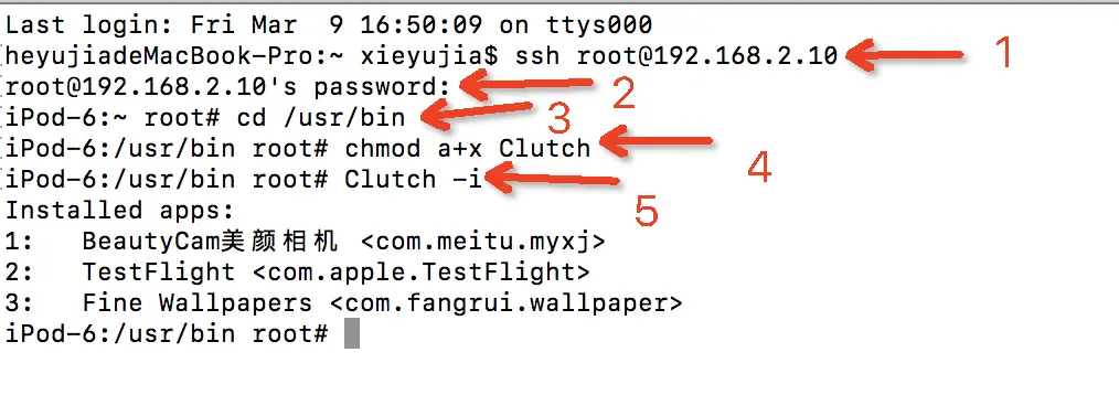 alpine,如果不是请删除OpenSSH重新安装。密码输入正确后,就会发现终端的前缀已经变成我们的手机设备命了。cd到我们把Clutch可执行文件放在手机的位置 cd /usr/bin 给Clutch加权限防止执行事权限不够chmod a+x Clutch