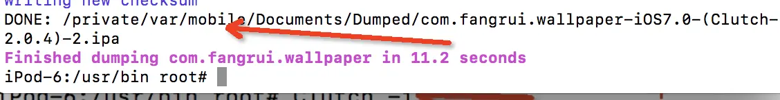Clutch -i 4.6 在终端中输入Clutch -d 1,这里输入的数字id是我们步骤5中使用Clutch -i打印出来的应用前面的数字id,如果你要破壳其他应用,请选择对应应用的id。等几十秒就会把破解的包导出来