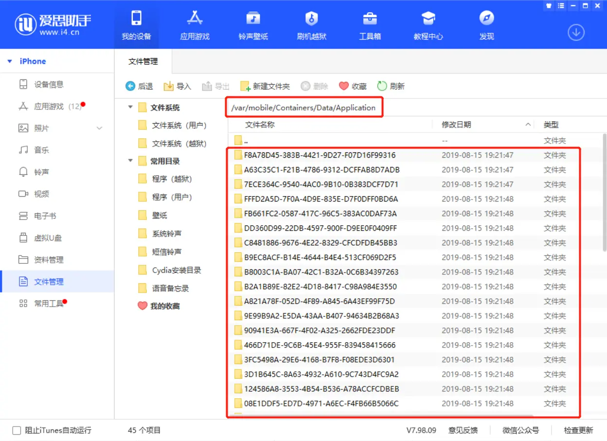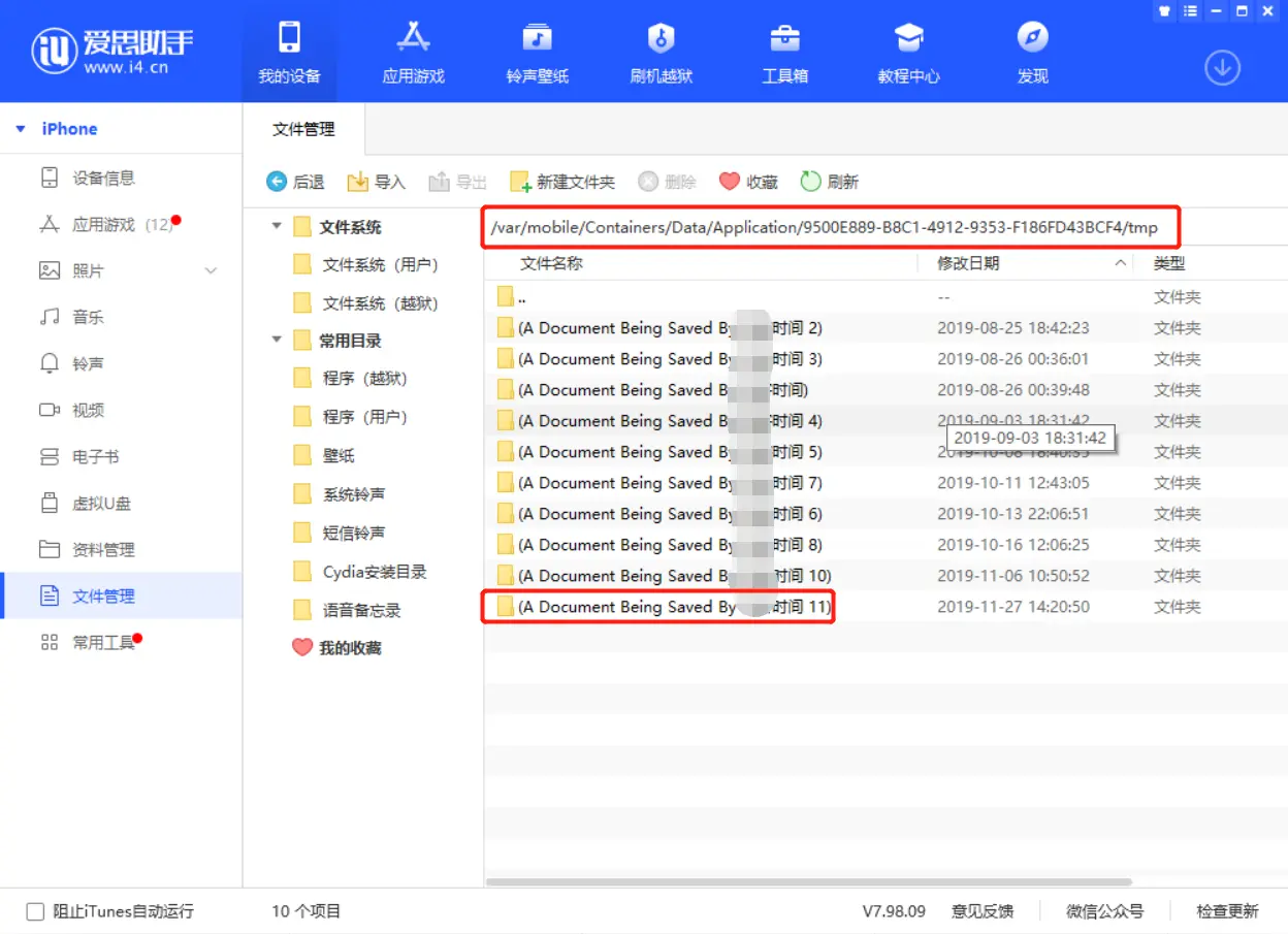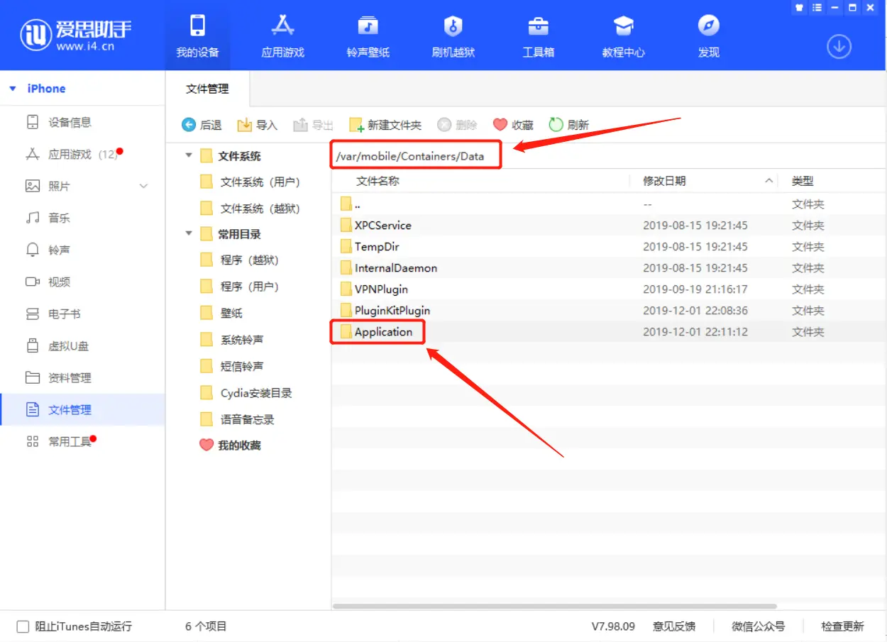2. 根据上面文章的路径, 在爱思助手内寻找同样的路径: