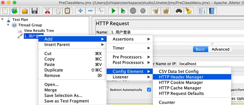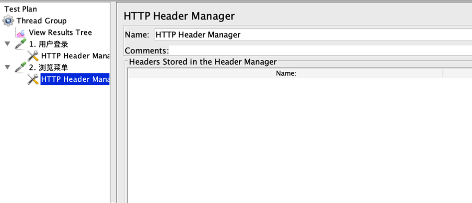 在HttpRequest中添加Http Header Manager,暂时保持Http Header Manager中为空,我们之后会对其进行配置