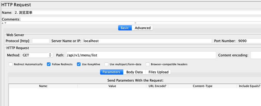 创建浏览菜单接口请求,添加HttpRequest请求。 配置请求名称:浏览菜单