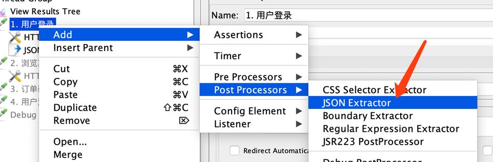 提取接口的JSON返回值,需要在对应的HttpRequest中添加JSON Extractor (JSON 提取器)
