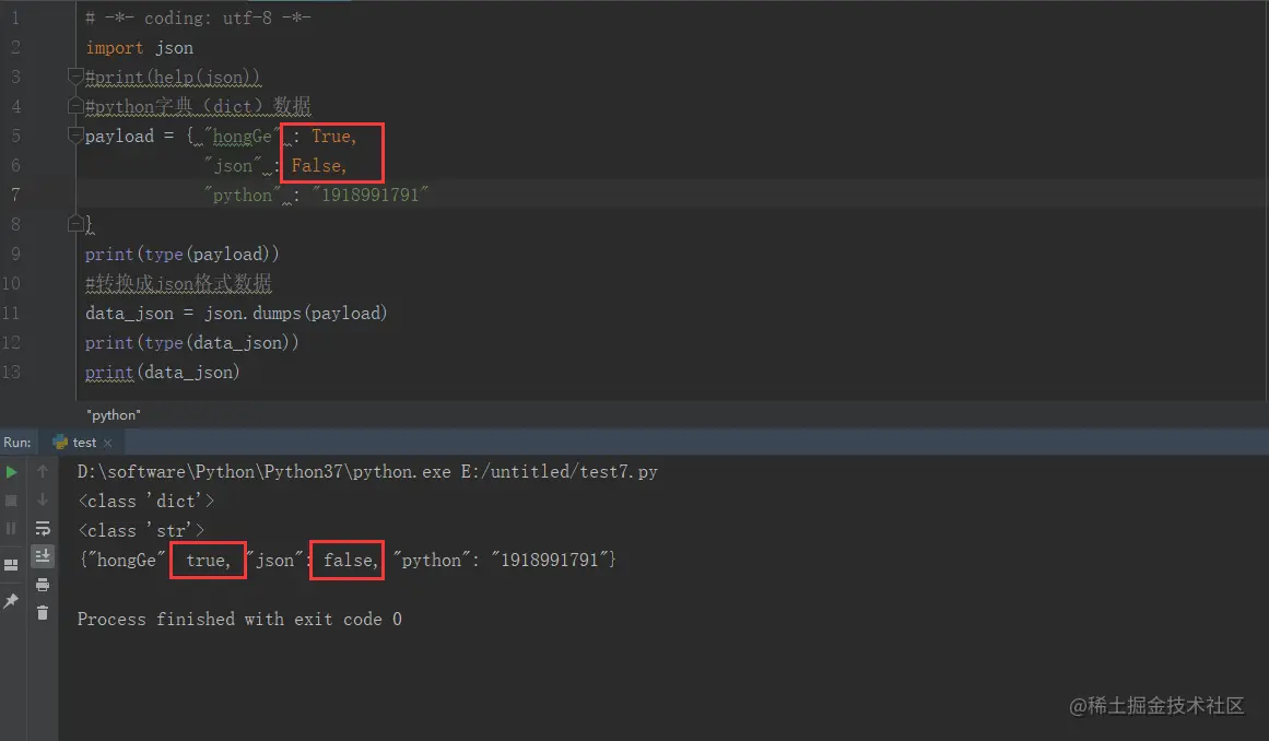 2、举个简单例子,下图的实例中 dict 类型经过 json.dumps()后变成 str,True 变成了 true,False变成了 fasle