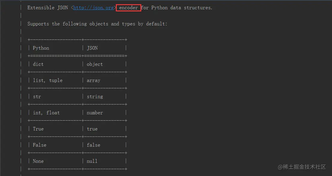 3、从json模块的对应源码中可以查看到,python 数据转化成 json可识别的数据,对应的表关系如下