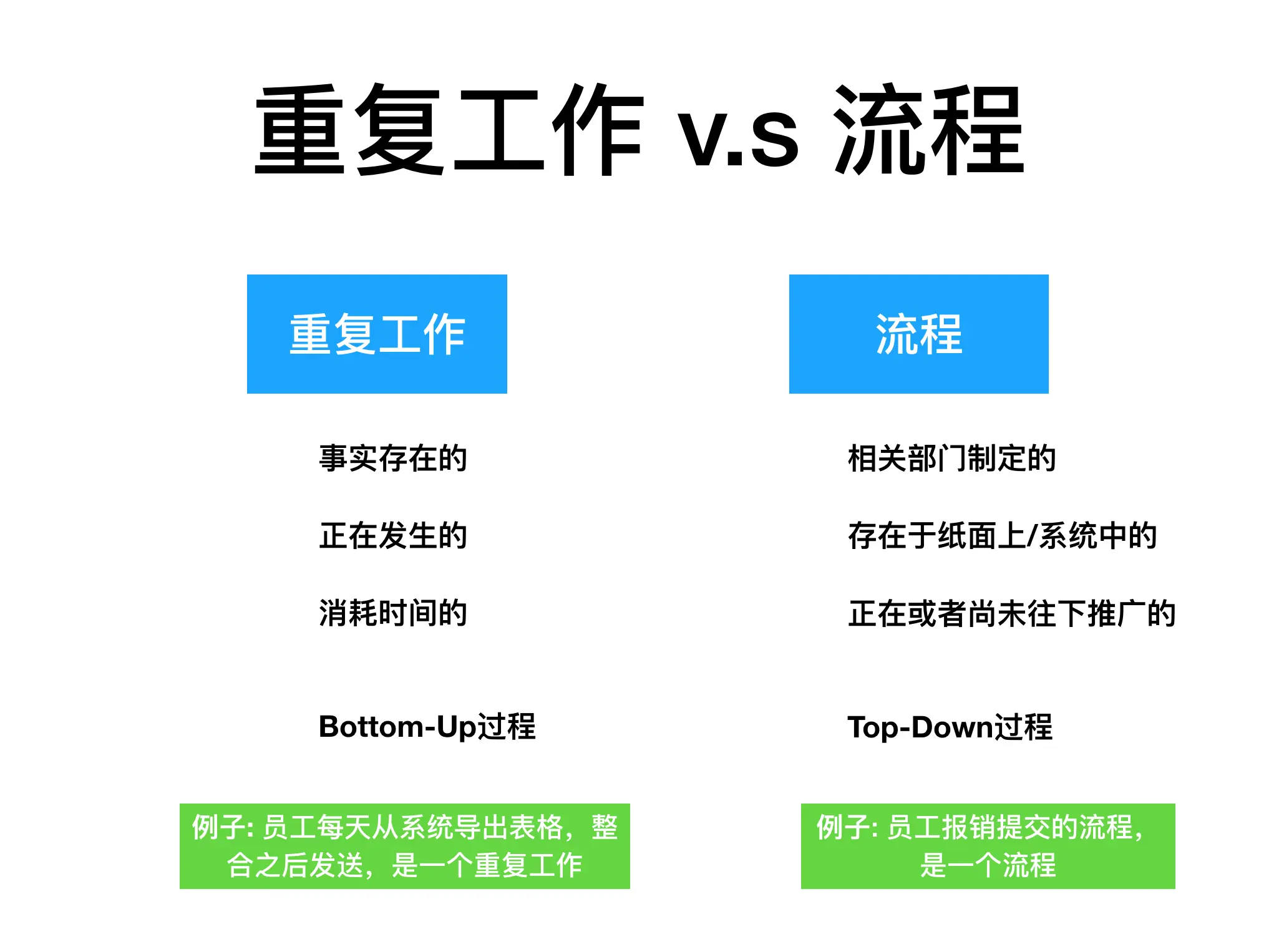 而今天,我们重新定义了一个术语,叫 “ 重复工作 ” 。 重复工作是自下而上的过程,是真实存在真实发生的。而流程是相关部门制定的,存在文档和系统中的(甚至可能和现实不一致),是自上而下的过程。