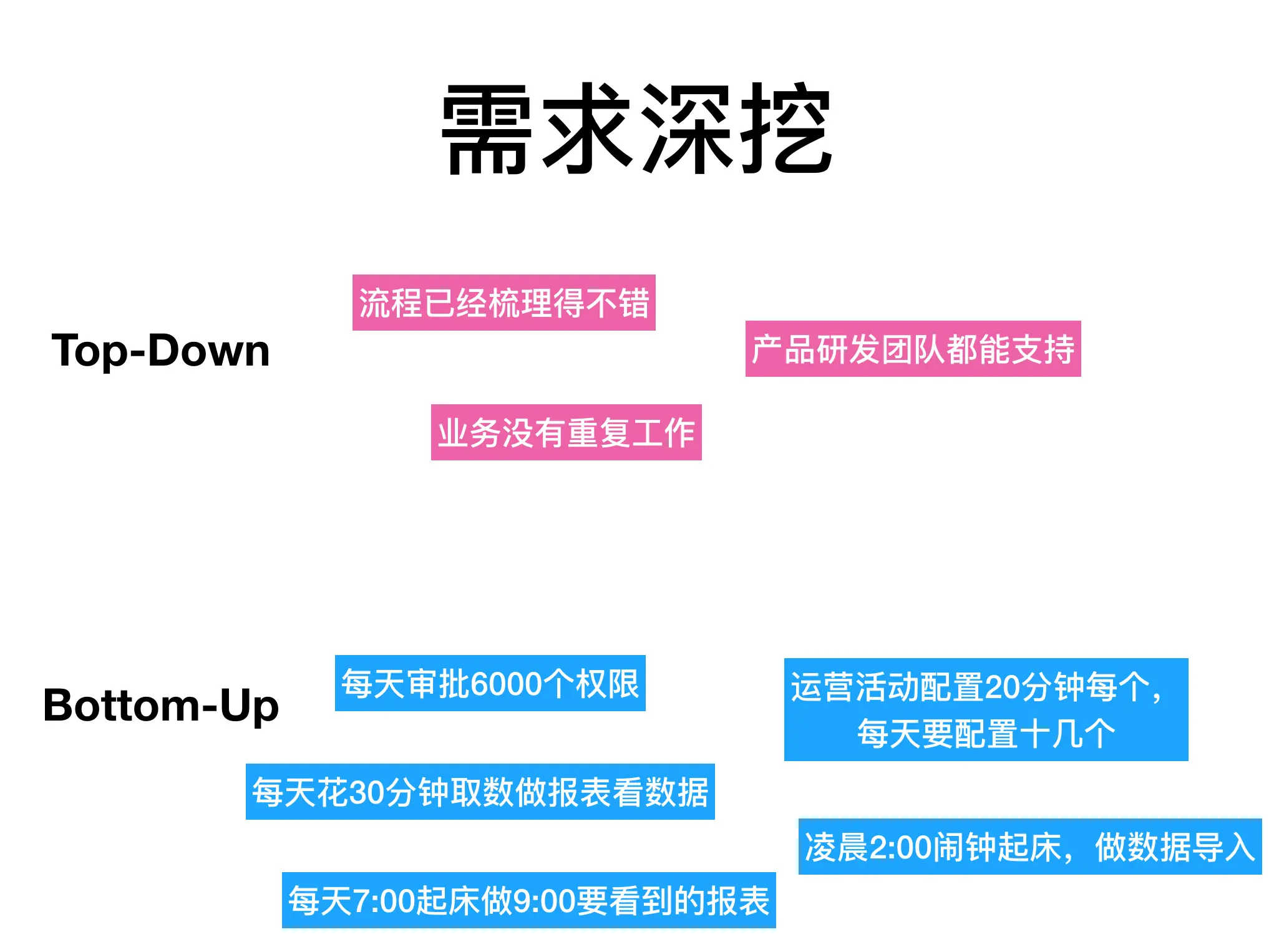 但是如果从更一线的员工了解他们每天在做什么,我们会得到不一样的图景:有同学 “ 每天审批 6000 个权限 ” ,有同学 “ 每天配置十几个运营活动,每个运营活动需要 20 分钟 ” ,有同学 “ 凌晨 2:00 起床把数据变成 CSV 报表,导入人群标签系统 ”