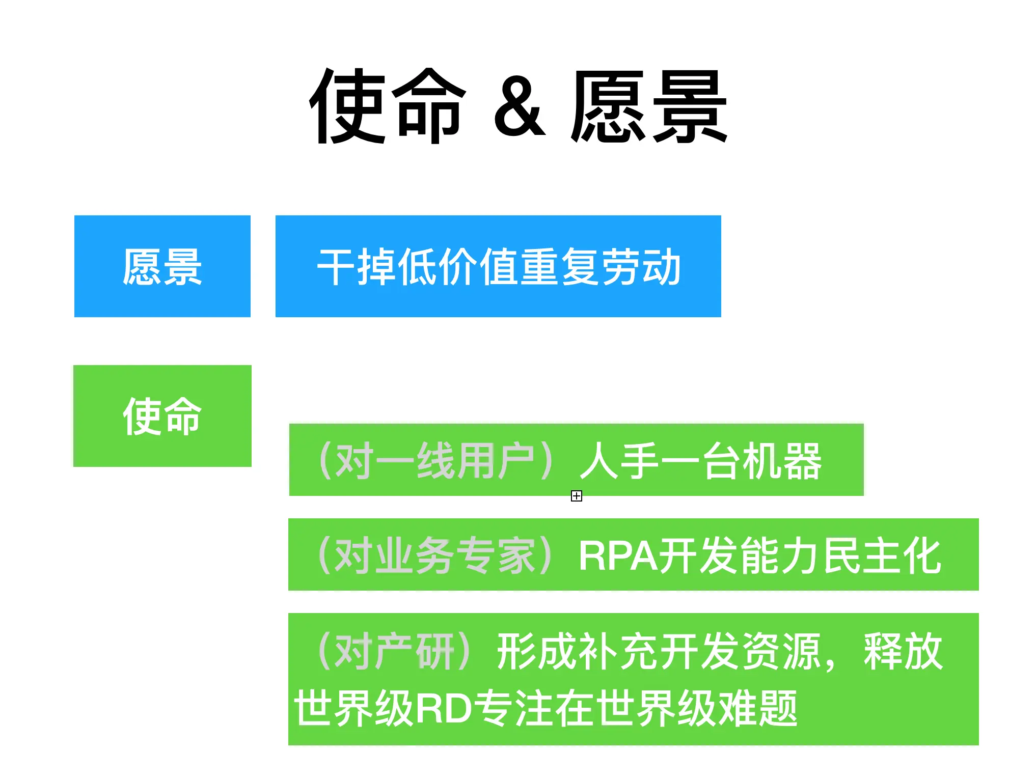 我们愿景很简单, “ 干掉低价值重复劳动 ” 。人最宝贵的是时间,很多公司 996 ,但是在每周的 72 个小时工作时间里面,有多少时间是在做创造性活动,而又多少是在重复工作。