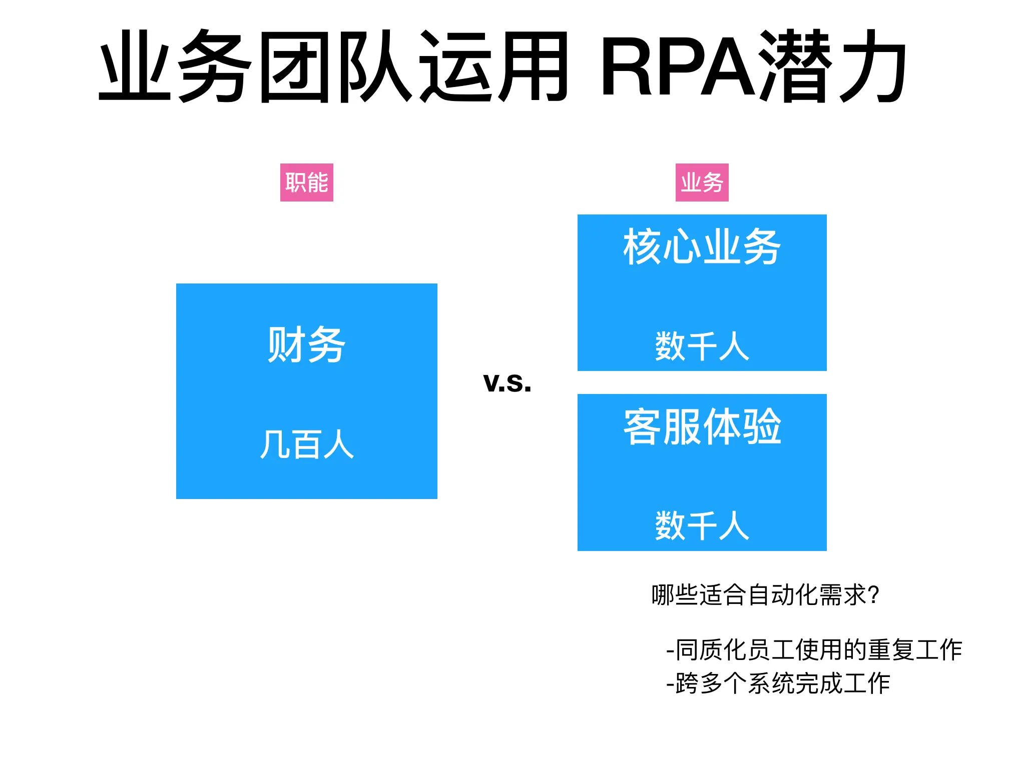 我们在业务里面做 RPA 的初衷很简单,财务几百人的规模,业务几千人是财务的 20 倍。那么应该有 20 倍的重复工作,也理应拿到 20 倍的收益。