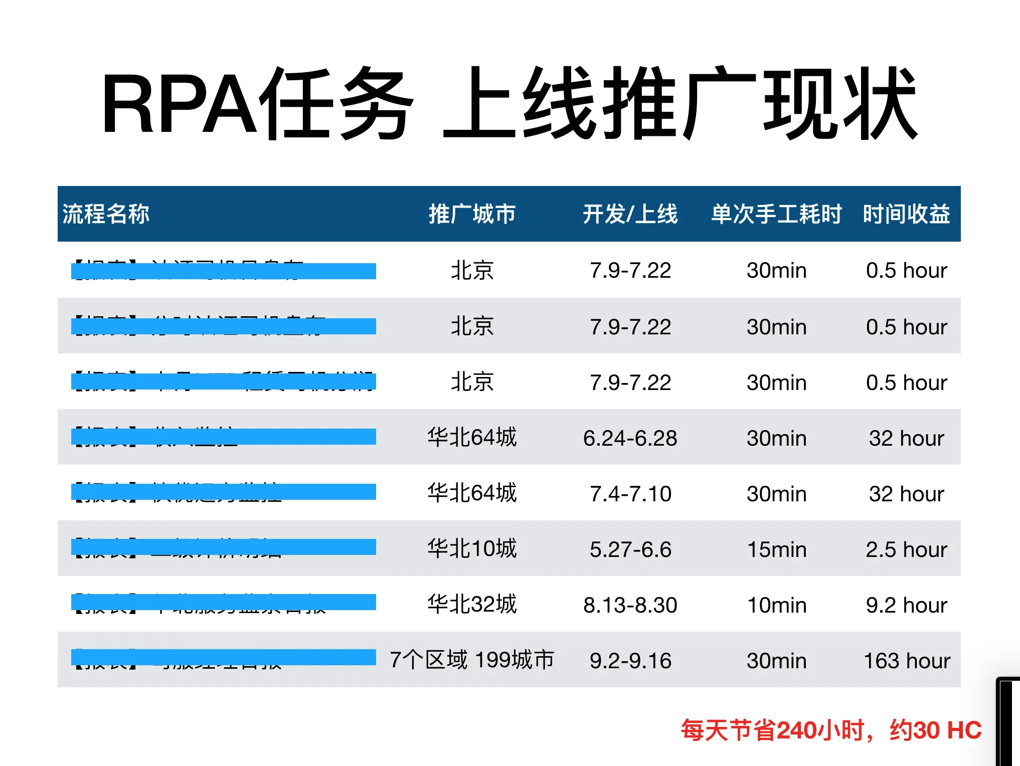 目前 RPA 解决的重复工作,每天为公司节省了 240 小时,合计 30 个 HC 。 7 月份开始做,投入 3 个人。算下来年化 20 倍的 ROI ,这个是极其惊人的数量。