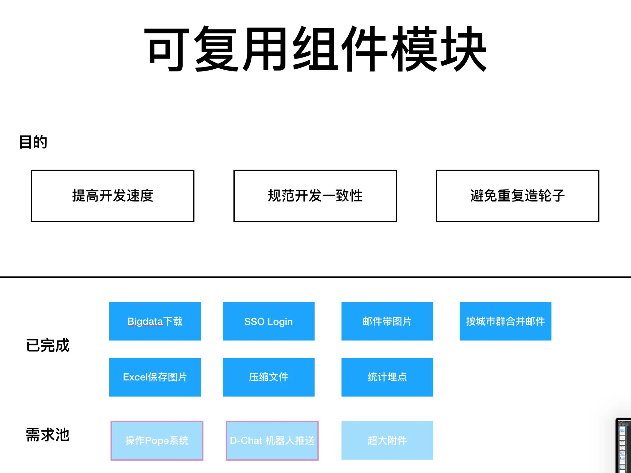 目前我们典型项目交付周期是 2.5 周,为了进一步提高交付速度,规范一致性,避免重复造轮子。我们设计了一套可复用模块的规范,并抽象出多个可复用模块。
