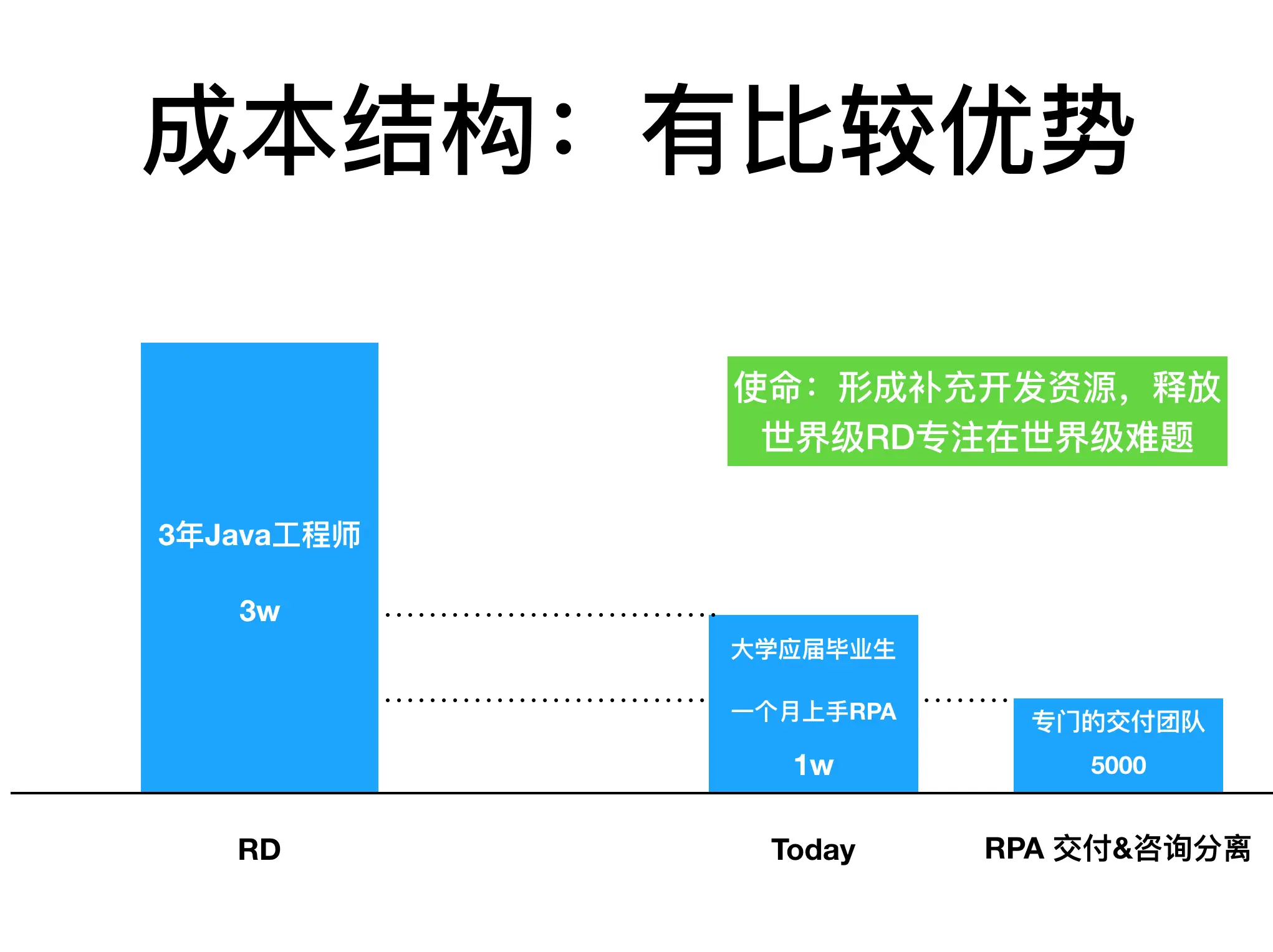 这样的结果是,传统工程师非常厉害,前端后端都能做,有绝对优势。而 RPA 这块实施的范围要弱一些,不能写 App 也不能做不存在的功能,只有操作键盘和鼠标。但正是因为 ” 弱 ” ,所有比较优势。