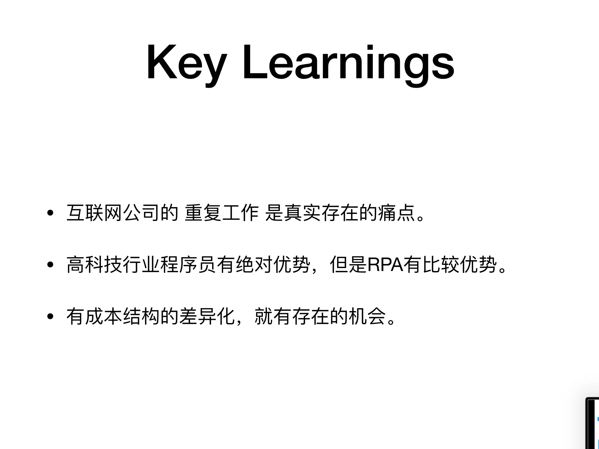 最后我们总结下,今天的 Key Learnings 有 3 个 : 1) 互联网公司的 重复工作 是真实存在的痛点。 2) 高科技行业程序员有绝对优势,但是 RPA 有比较优势。 3) 有成本结构的差异化,就有存在的机会。