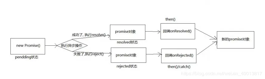 pending 状态的 Promise 对象可能会变为fulfilled 状态并传递一个值给相应的状态处理方法,也可能变为失败状态(rejected)并传递失败信息。当其中任一种情况出现时,Promise 对象的 then 方法绑定的处理方法(handlers )就会被调用(then方法包含两个参数:onfulfilled 和 onrejected,它们都是 Function 类型。当Promise状态为