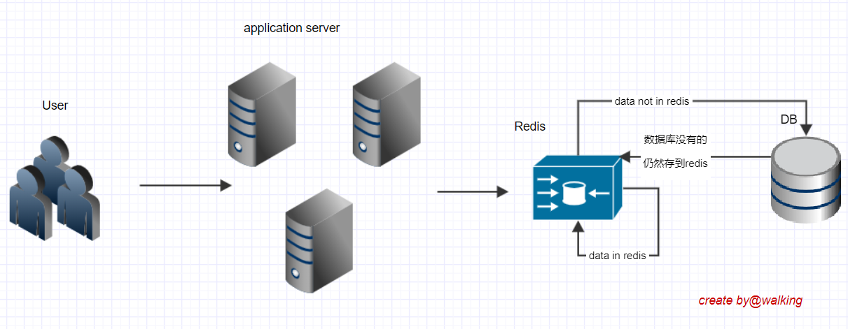 进来先查缓存有没有对应的数据,缓存里有就直接返回,没有则查库,库里有就存缓存。这样redis就分担了一部分数据库的压力。