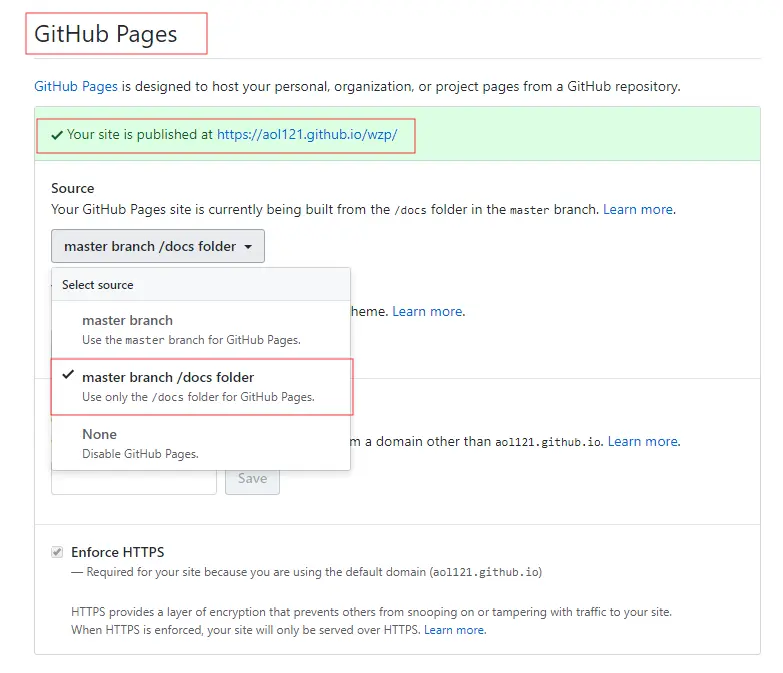 Source上面一行浅蓝色底文字是你设置好以后的博客地址,类似:Your site is published at aol121.github.io/wzp/
