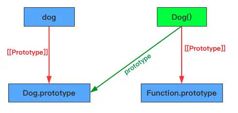 obj的内部属性[[Prototype]]指向构造函数Dog的原型,即obj.[[Prototype]] = Dog.prototype; - Step 3:将构造函数