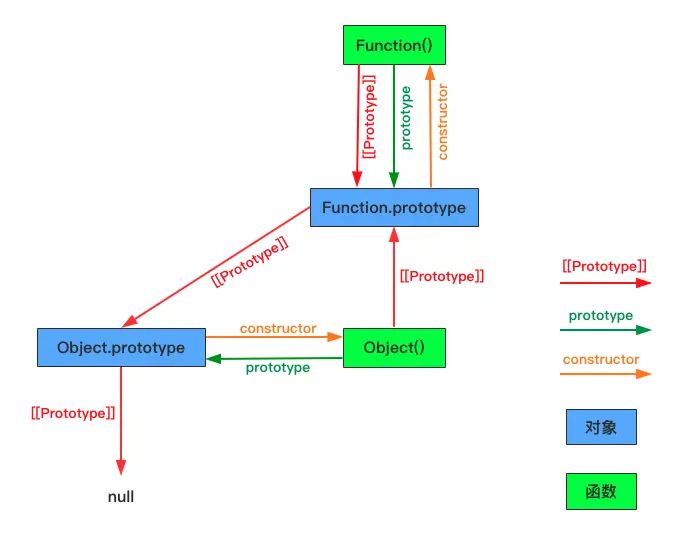 [[Prototype]]内部属性,指向原型对象,其中Object.prototype.[[Prototype]]指向null,以表示原型查找的终点; prototype对象上挂载了constructor属性,指向构造函数;