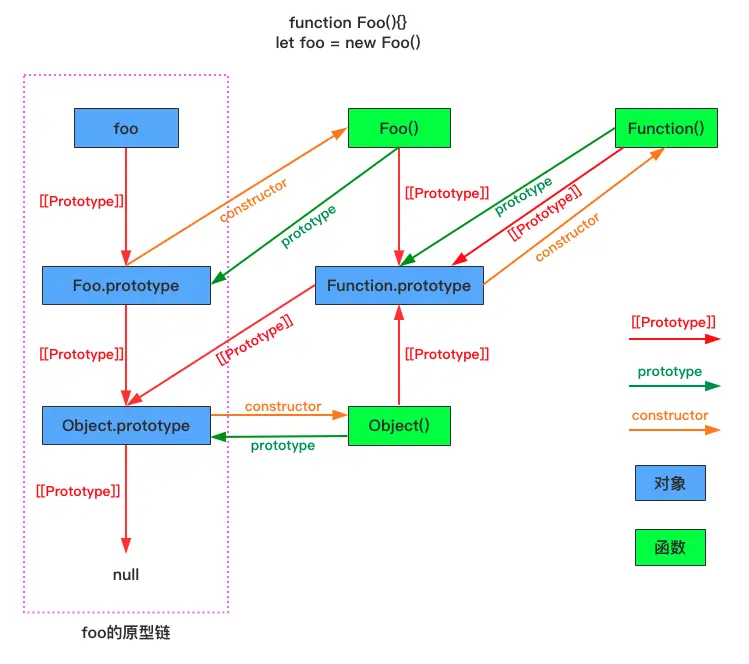如果你想真实看到这条“链”,那么它就是关系图中的粉色虚线框所示,但是这里原型链只是宾语,谈论原型链时,不可以丢失主语,即foo对象的原型链。直观的说,原型链就是对象间用[[Prototype]]内部属性串联起来的单向链表。