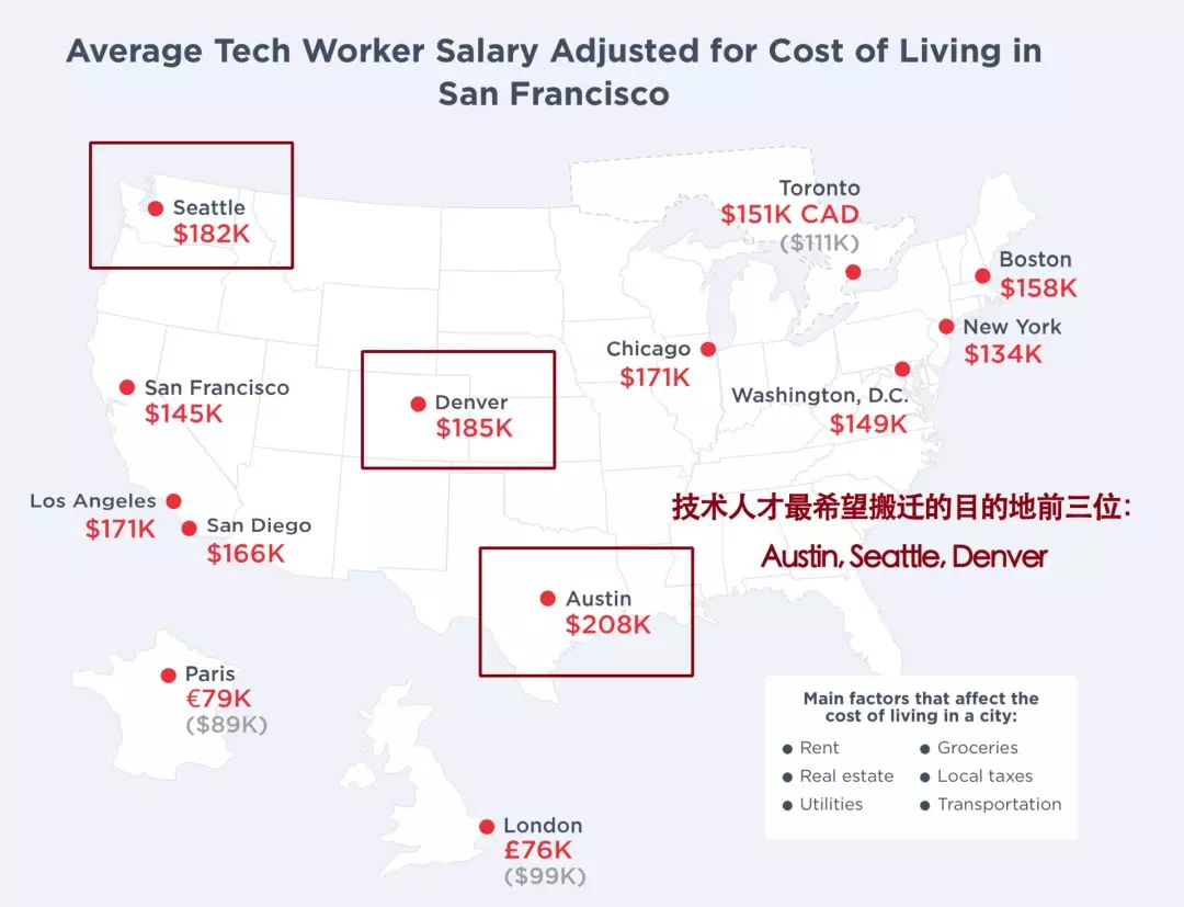 在Hire.com有这么一个调查,考虑进生活开支,把不同地区的工资折算成旧金山的工资数目来计算城市的性价比。用其他地区的薪资来与湾区进行对比,性价比最高的是德克萨斯州首府奥斯汀,其次是加拿大多伦多和西雅图。