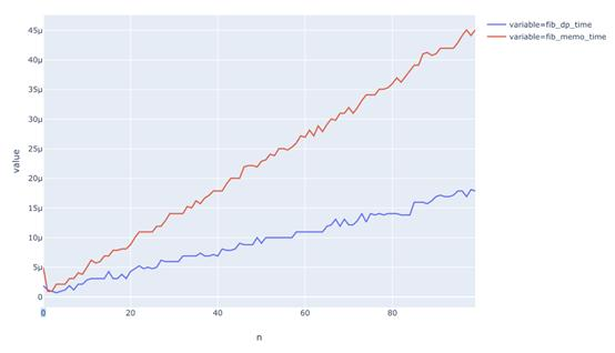 上图是“动态规划”和“记忆化”运行时间的比较。可以看出它们都是线性的,但动态规划更快一点。