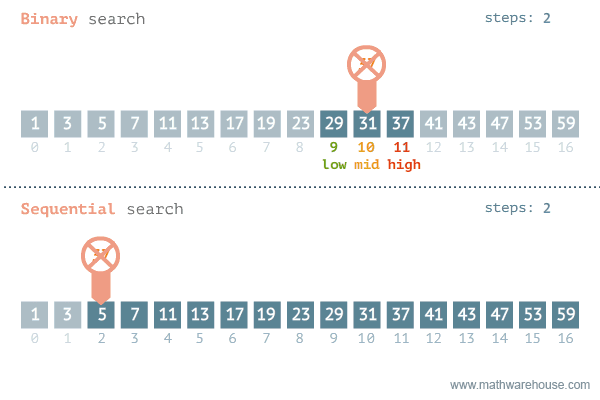 这是一个基于递归算法的高级例子。利用数组被排序的事实,递归地查看中间元素,看看是想在中间元素的左边还是右边搜索。这使得每一步的搜索空间减少2倍。