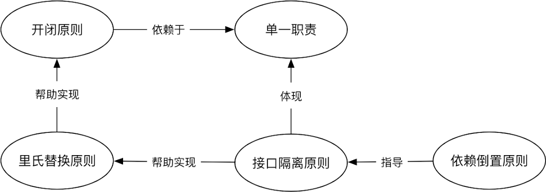先抛出我的观点: 单一职责是所有设计原则的基础,开闭原则是设计的终极目标。里氏替换原则强调的是子类替换父类后程序运行时的正确性,它用来帮助实现开闭原则。而接口隔离原则用来帮助实现里氏替换原则,同时它也体现了单一职责。依赖倒置原则是过程式编程与OO编程的分水岭,同时它也被用来指导接口隔离原则。关系如下图: