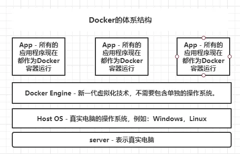 docker架构是:物理机 -> 宿主机操作系统 -> docker引擎 -> 应用程序