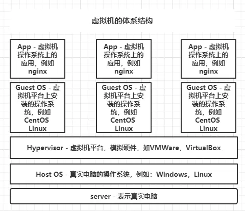 传统的虚拟机架构是:物理机 -> 宿主机操作系统 -> Hypervisor支持 -> 虚拟机操作系统 -> 应用程序