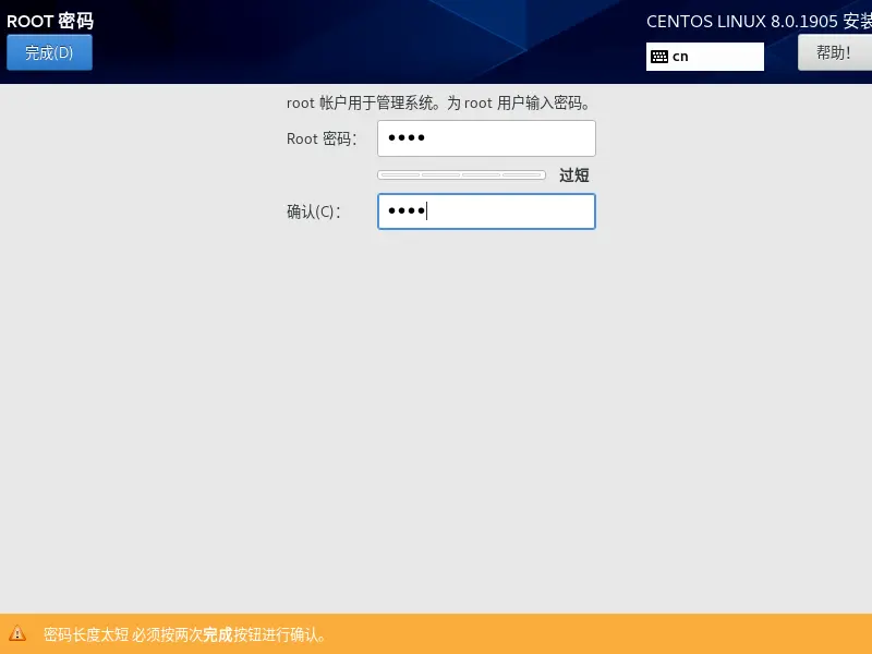 centos有密码校验机制,当密码比较简单的时候,会让你点击两次完成按钮