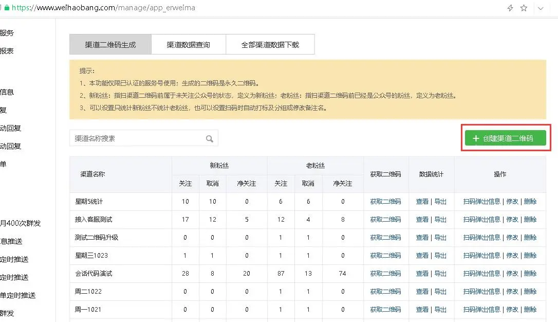 公众号生成带统计的渠道二维码,通过公众号开发接口生成带参数的二维码实现,记录粉丝关注取关的结果,包含粉丝昵称、粉丝头像等都是公众号平台提供的接口开发。微号帮平台现有功能渠道二维码生成实现,也可以自己开发根据接口规则开发。