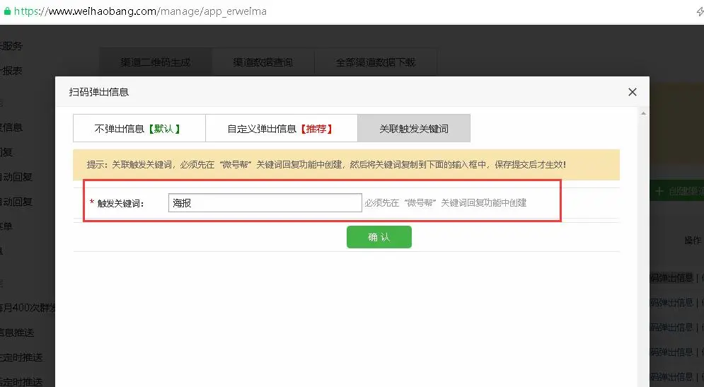 微号帮平台支持每个渠道二维码弹出不同的消息,文本信息、图文消息、小程序、卡券、图片、视频、音频统统都可以设置成扫码回复消息。还可关联关键词回复功能里的关键词。