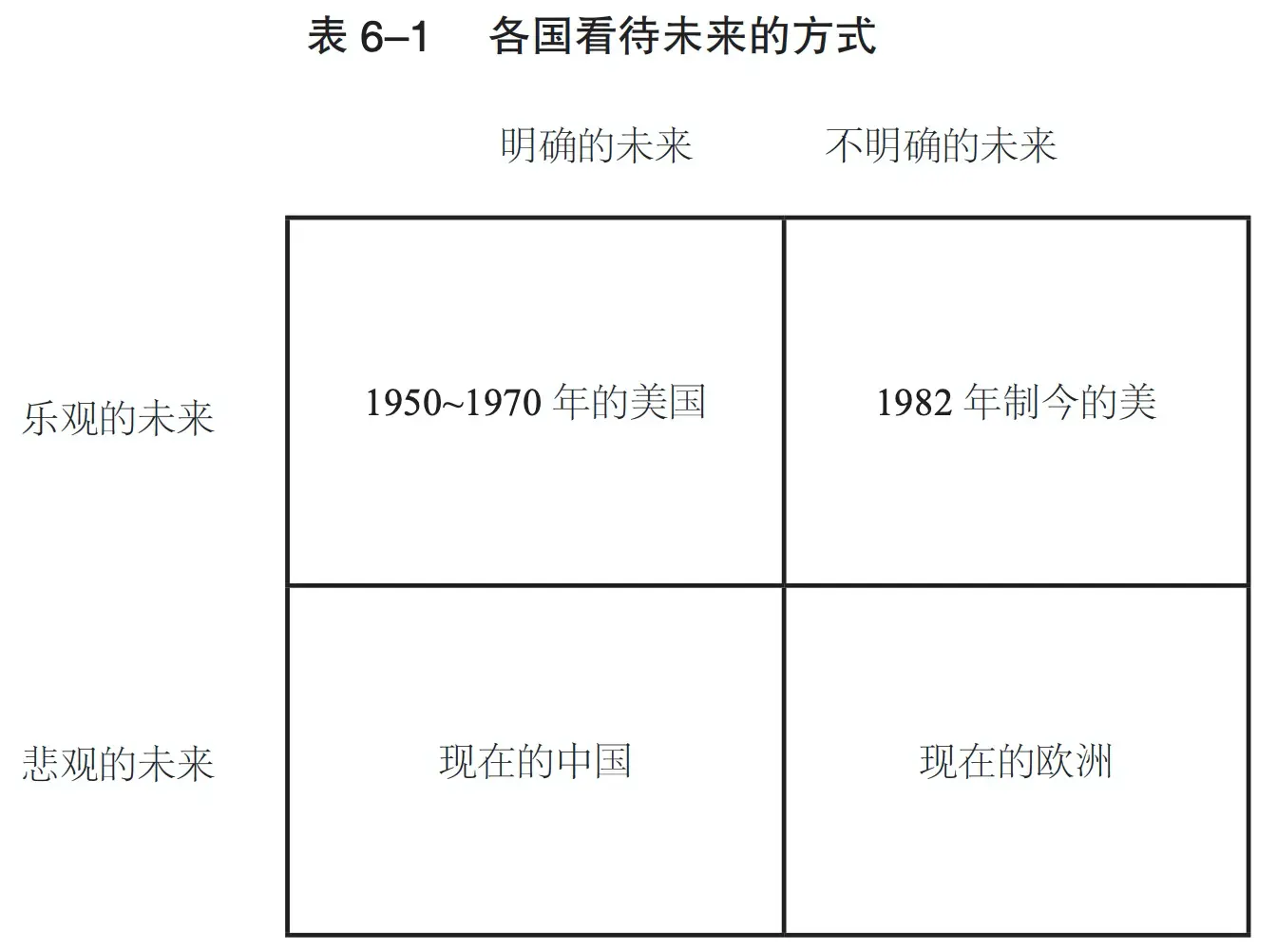 - 不明确乐观的未来:1982 至今的美国,由于技术发展遇到了瓶颈,比如生物制药和医疗都有巨大不确定性,人们只知道未来是美好的,但不知道何时可以到来。