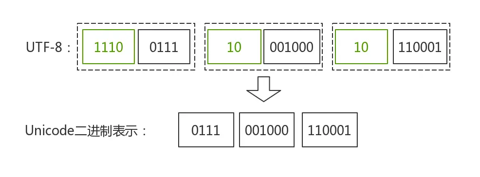 - 对于n字节的符号(n>1),第一个字节的前n位都设为1,第n+1位设为0,后面字节的前两位一律设为10,剩下的没有提及的二进制位,全部为这个符号的Unicode码。