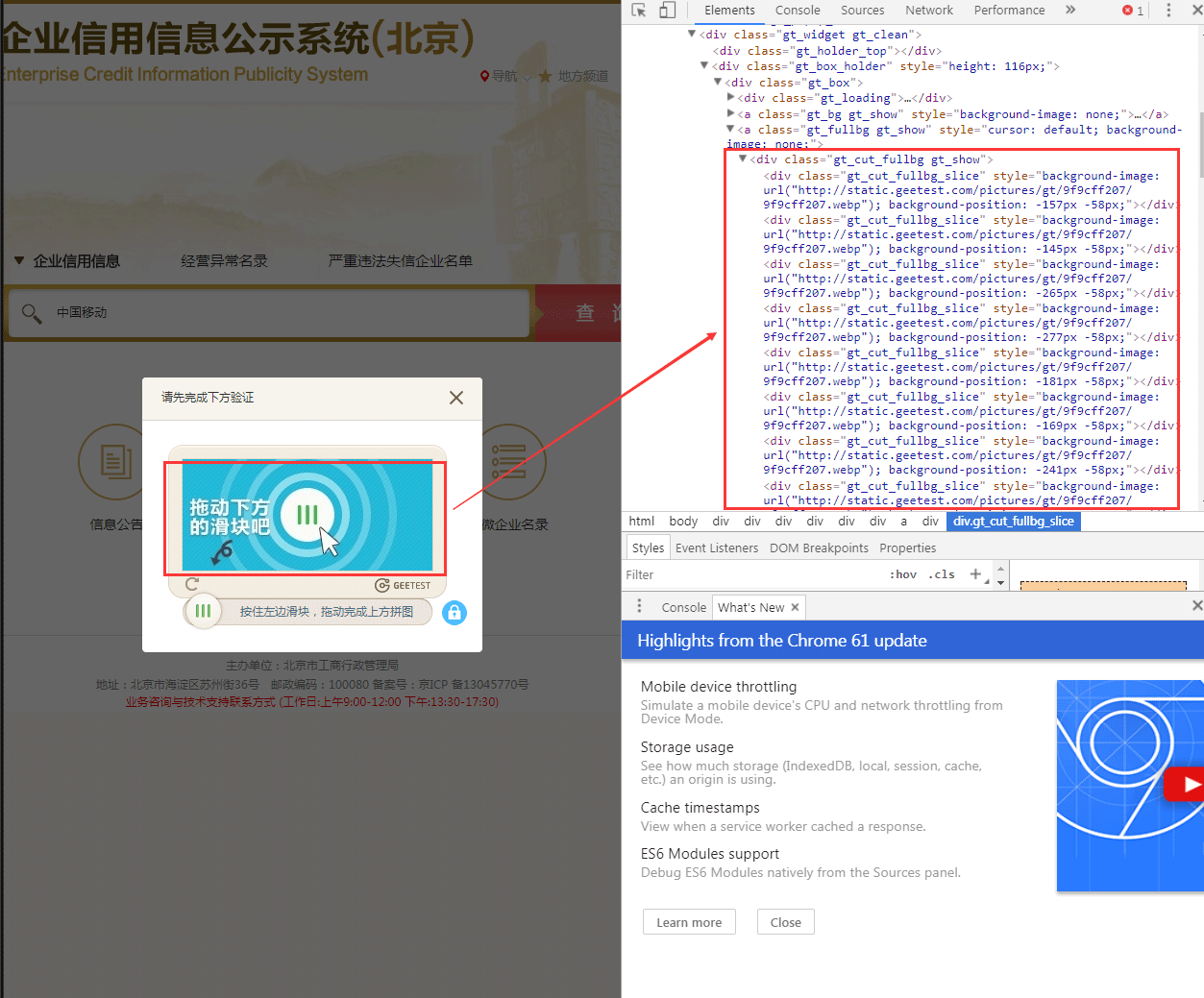 可以看到,图片是很多图片合成的,也就是说你只保存所有地址的图片是不行的。它是通过background-position的方法进行合成的。每一个图片是乱的,这个怎么搞?很简单,抓取这些图片的链接,然后根据链接的图片,再合成这张没有缺口的图片,获取缺口图的方法也是如此,都是自己合成。