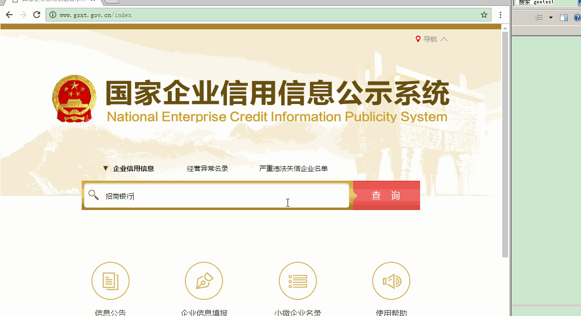 我们以国家企业信用信息公式系统为例,这是一个企业信息查询的网站,在每次查询都需要进行一次验证码识别。它所使用的就是GEETEST验证码,它的URL:点我查看
