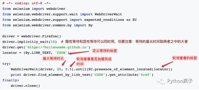 WebDriverWait(driver, 超时时长, 调用频率, 忽略异常).until(可执行方法, 超时时返回的信息)