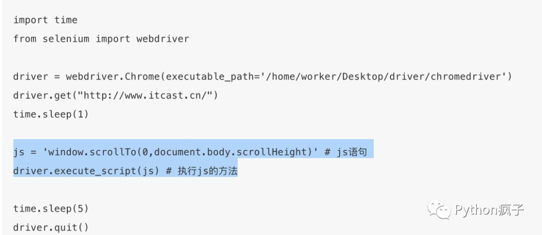 selenium执行js代码 js = 'window.scrollTo(0,document.body.scrollHeight)' # js语句 driver.execute_script(js) # 执行js的方法