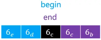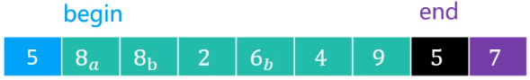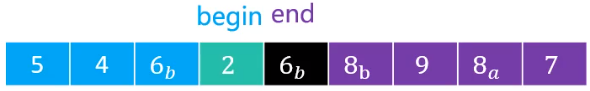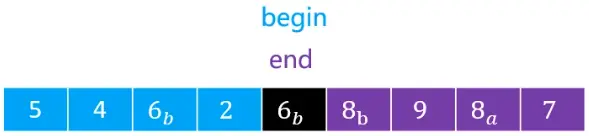 假设现在有下列的序列,这个序列有点特殊,其中有两个6,两个8,为了表示区分,方别用6a/6b,8a/8b来表示,其中begin指向首元素,end指向末尾元素(这里的end和前面章节的end指向的位置有一点区别)