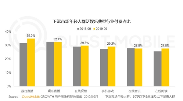 根据QuestMobile发布的《2019中国移动互联网秋季大报告》指出,下沉市场年轻人群在泛娱乐行业的付费习惯已初步养成,以游戏直播、娱乐直播、在线视频等为代表的互动性较强的直播类娱乐方式更容易让下沉年轻人群付费打赏。