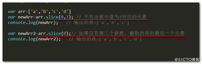 数组的截取方法返回新的数组,可传两个参数;注意:不会改变原来数组;传入的参数都是代表元素的下标
