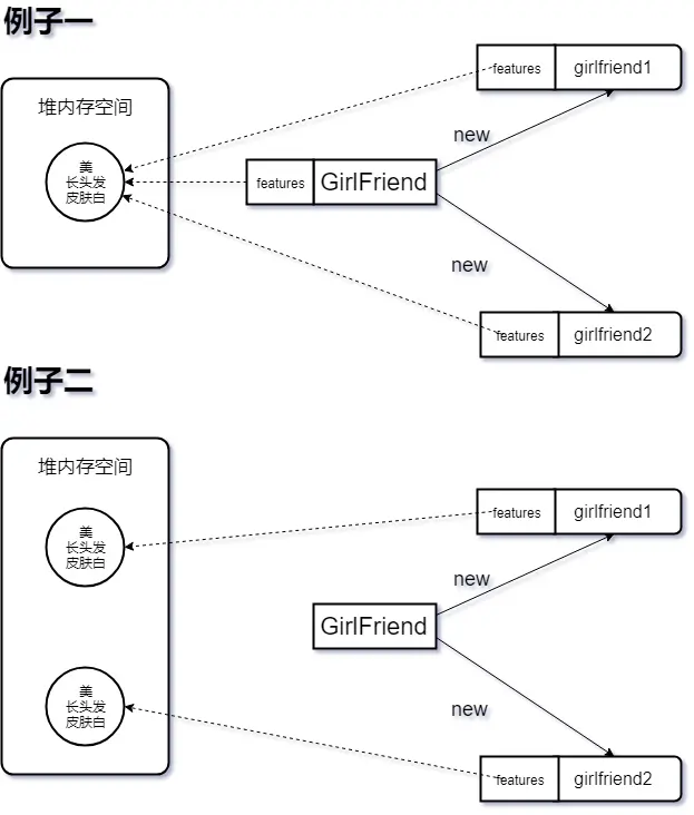 例子一中,在构造函数的原型定义中就开辟了内存空间存储了数组并用 features 指向该内存,new 的时候只是将两个实例的 features 指向了那个内存,所以调用 girlfriend1 的addFeatures会将 girlfriend2 的也一起修改。